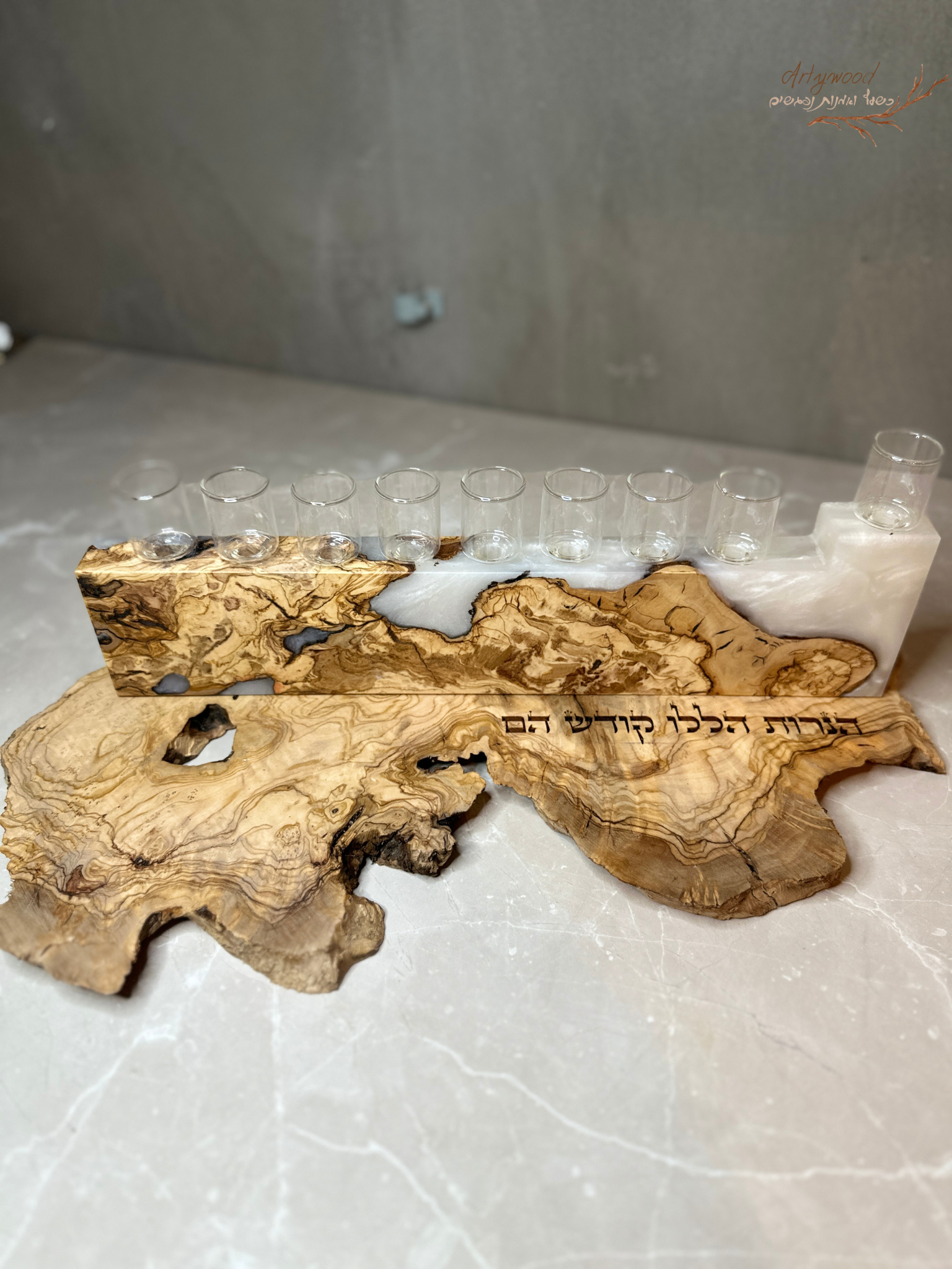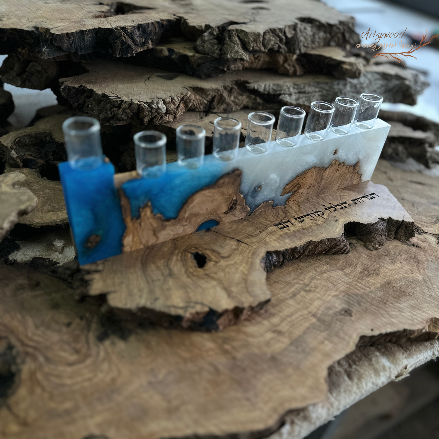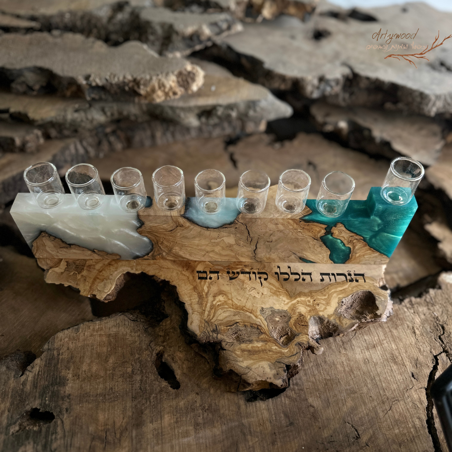 חנוכייה מעוצבת עשויה בעבודת יד מעץ זית ישראלי מלא בשילוב אפוקסי קריסטלי איכותי נוגד הצהבה בגוון לבחירה