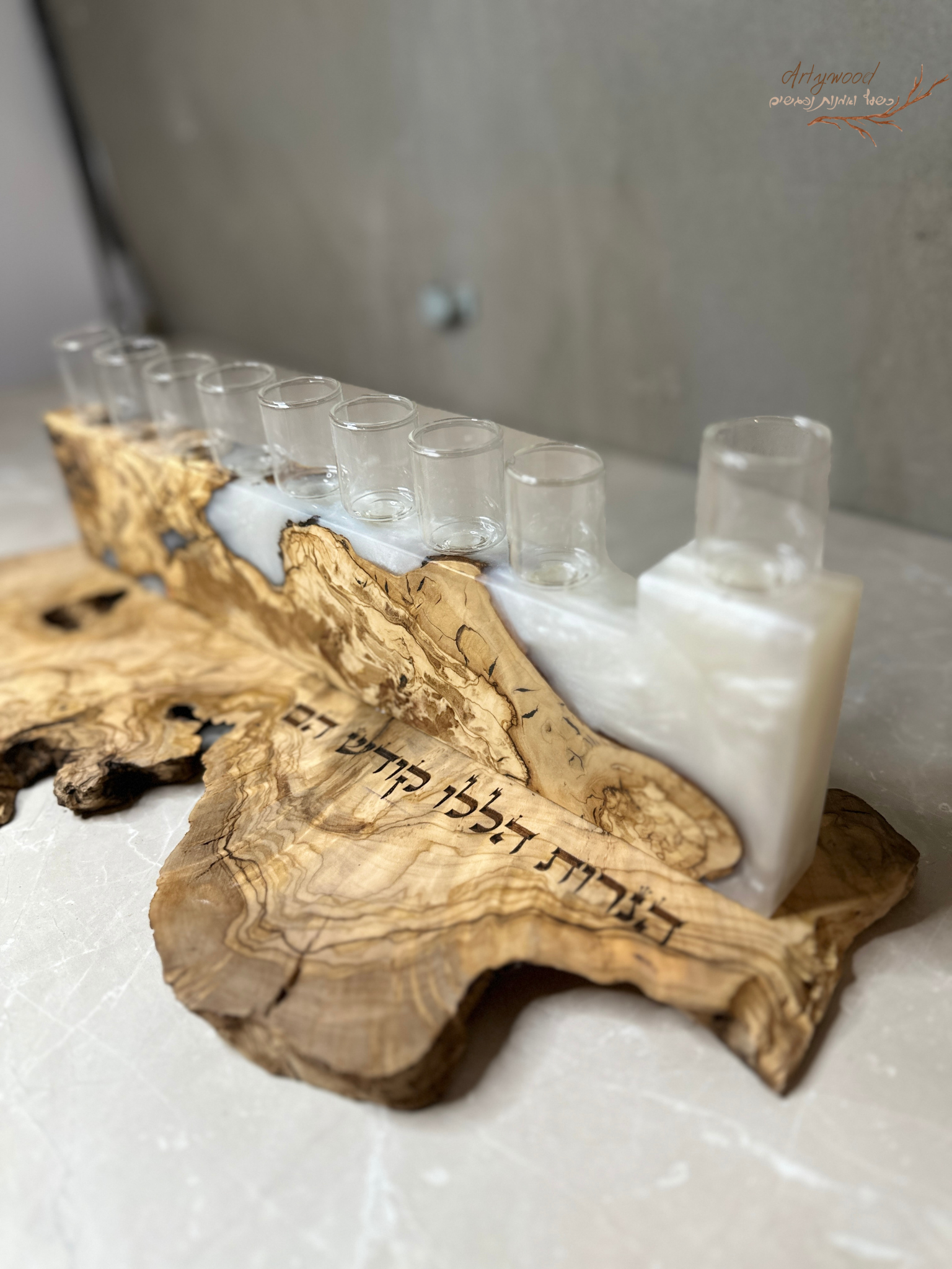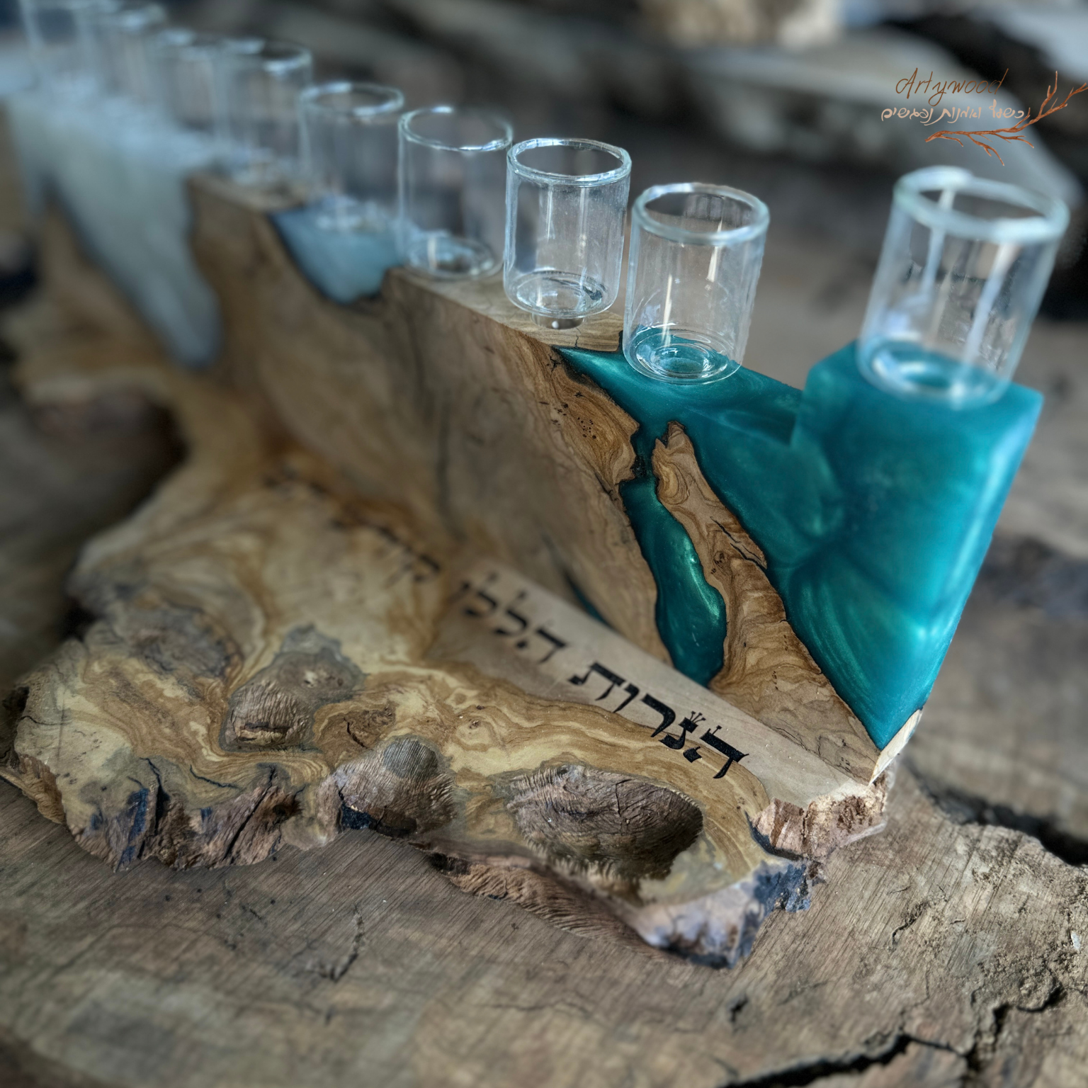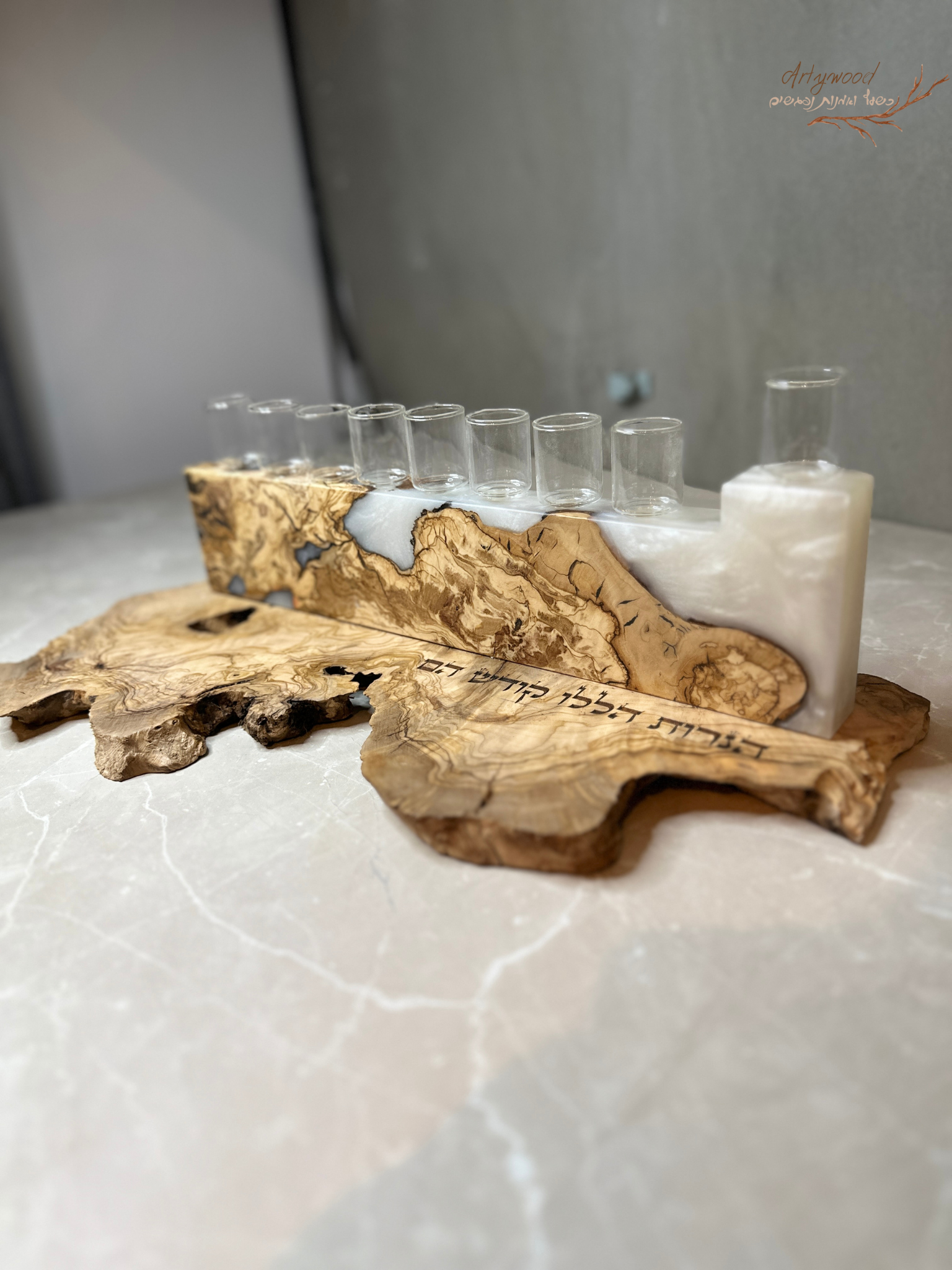 חנוכייה מעוצבת עשויה בעבודת יד מעץ זית ישראלי מלא בשילוב אפוקסי קריסטלי איכותי נוגד הצהבה בגוון לבחירה