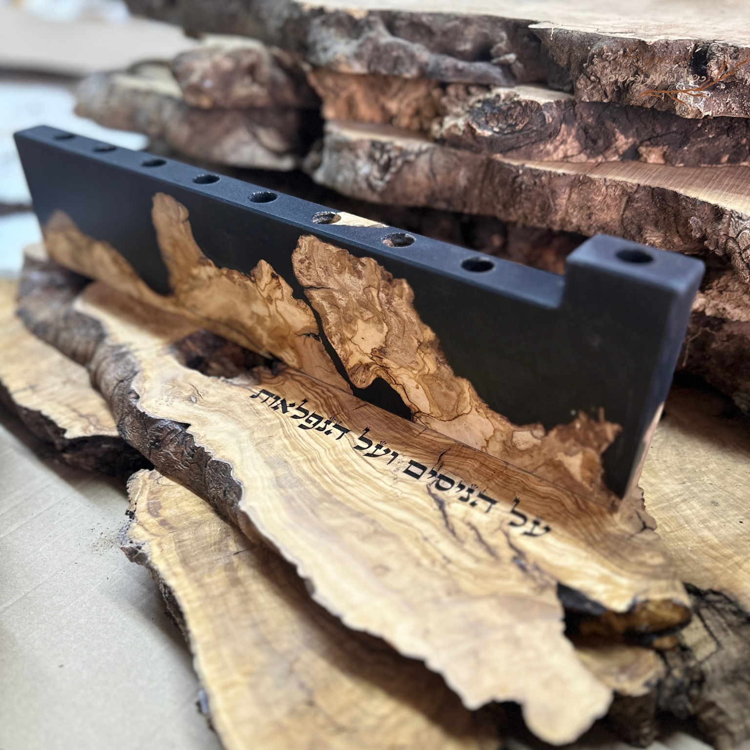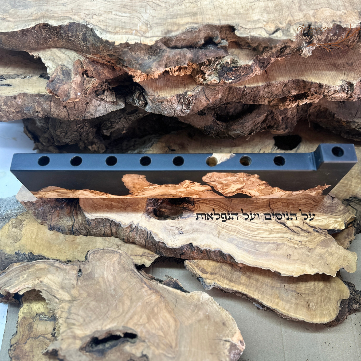 החנוכייה מגיעה על גבי פלטת עץ זית טבעית בתוספת חריטת לייזר בהתאמה אישית.