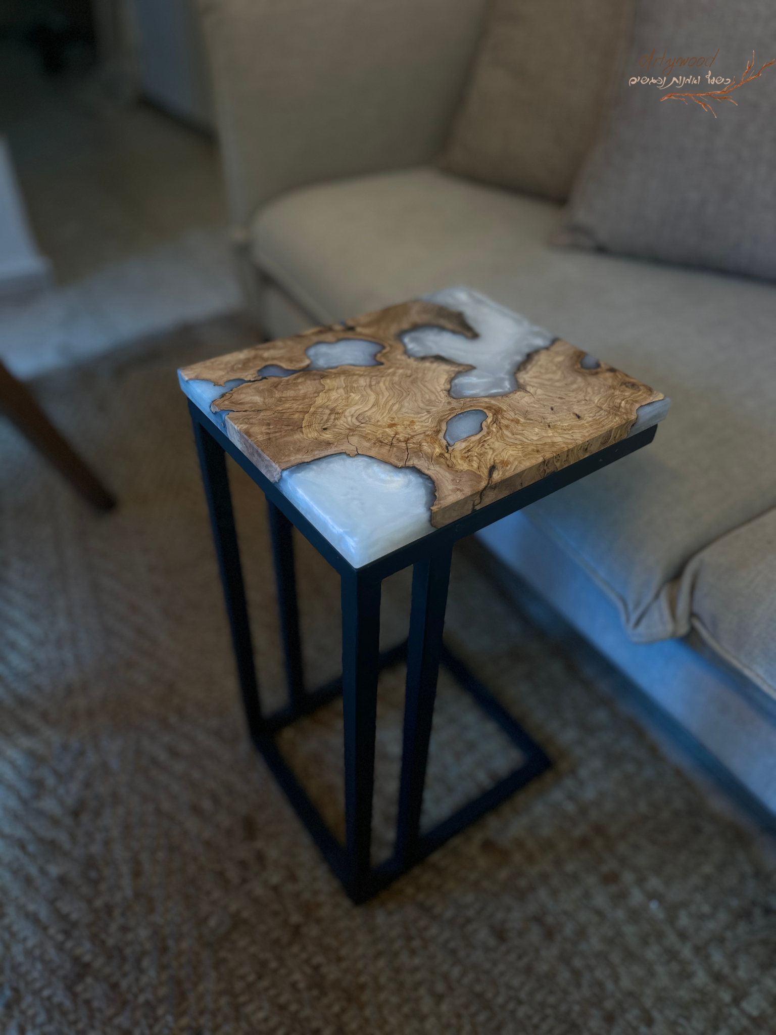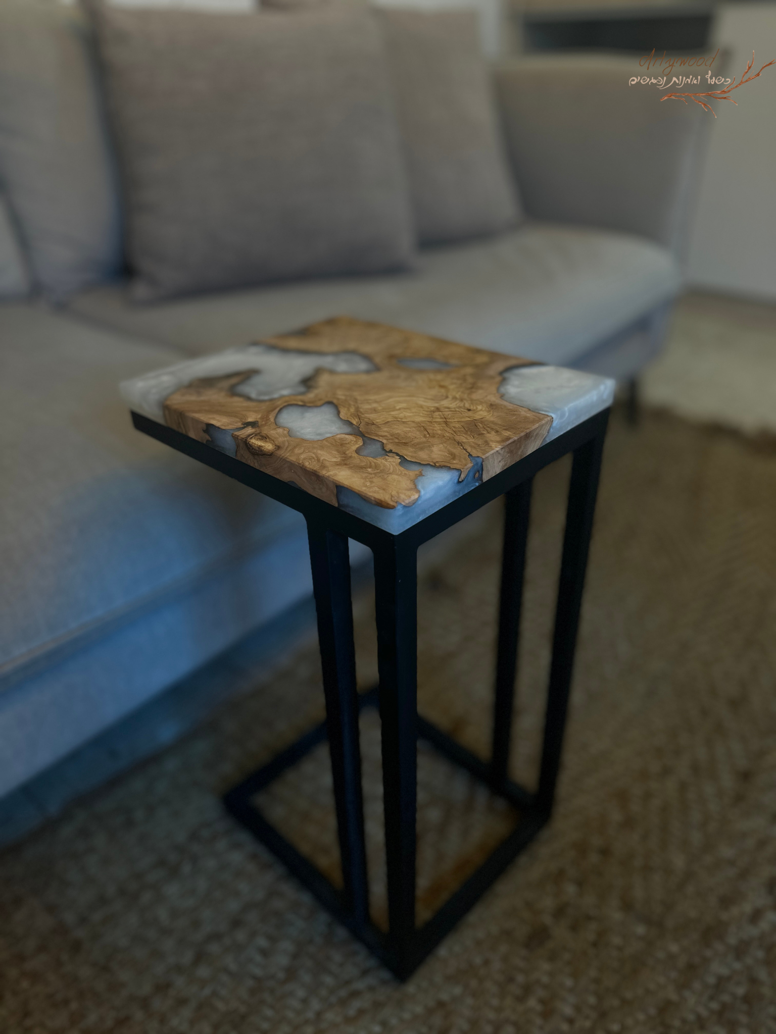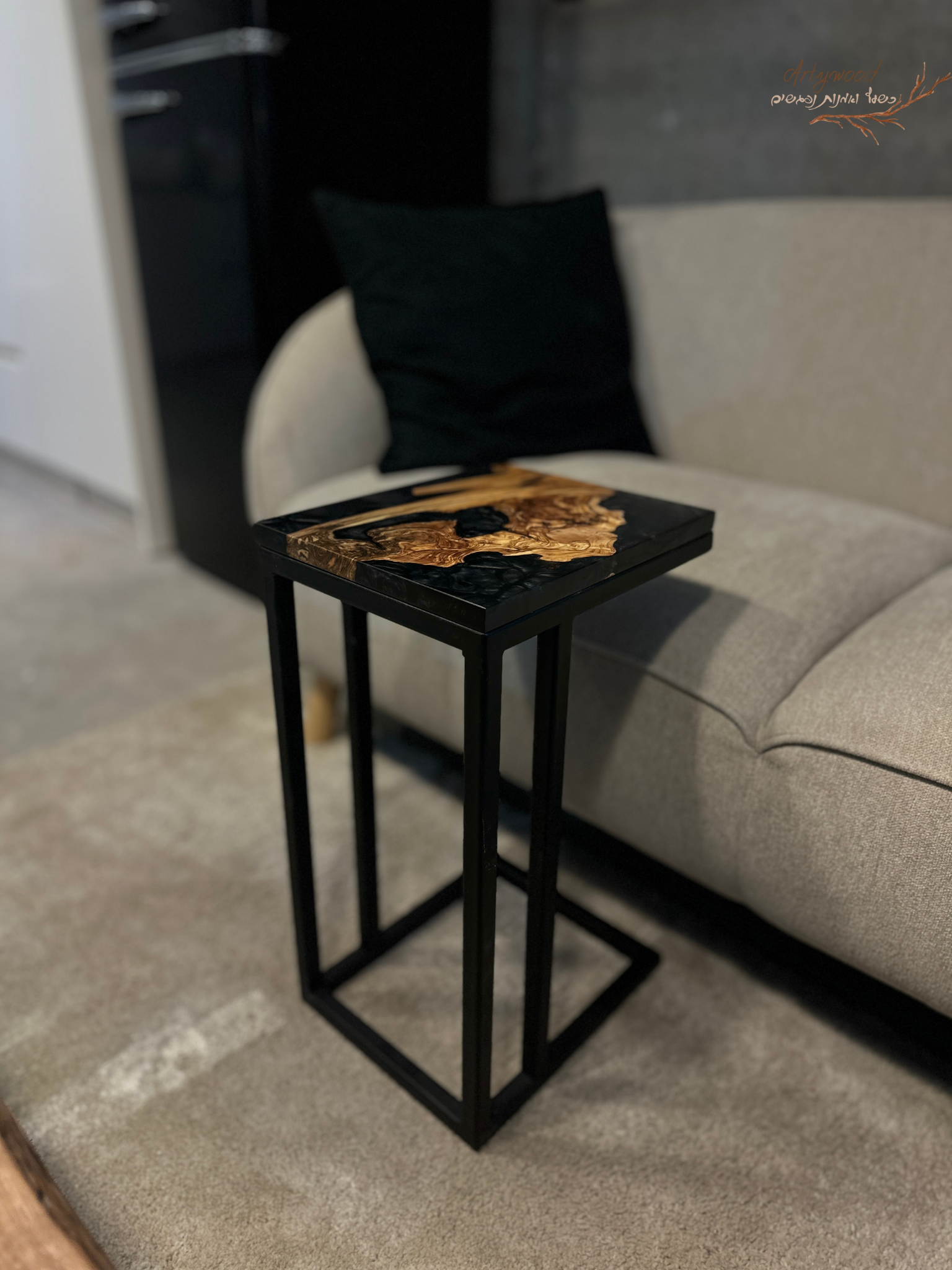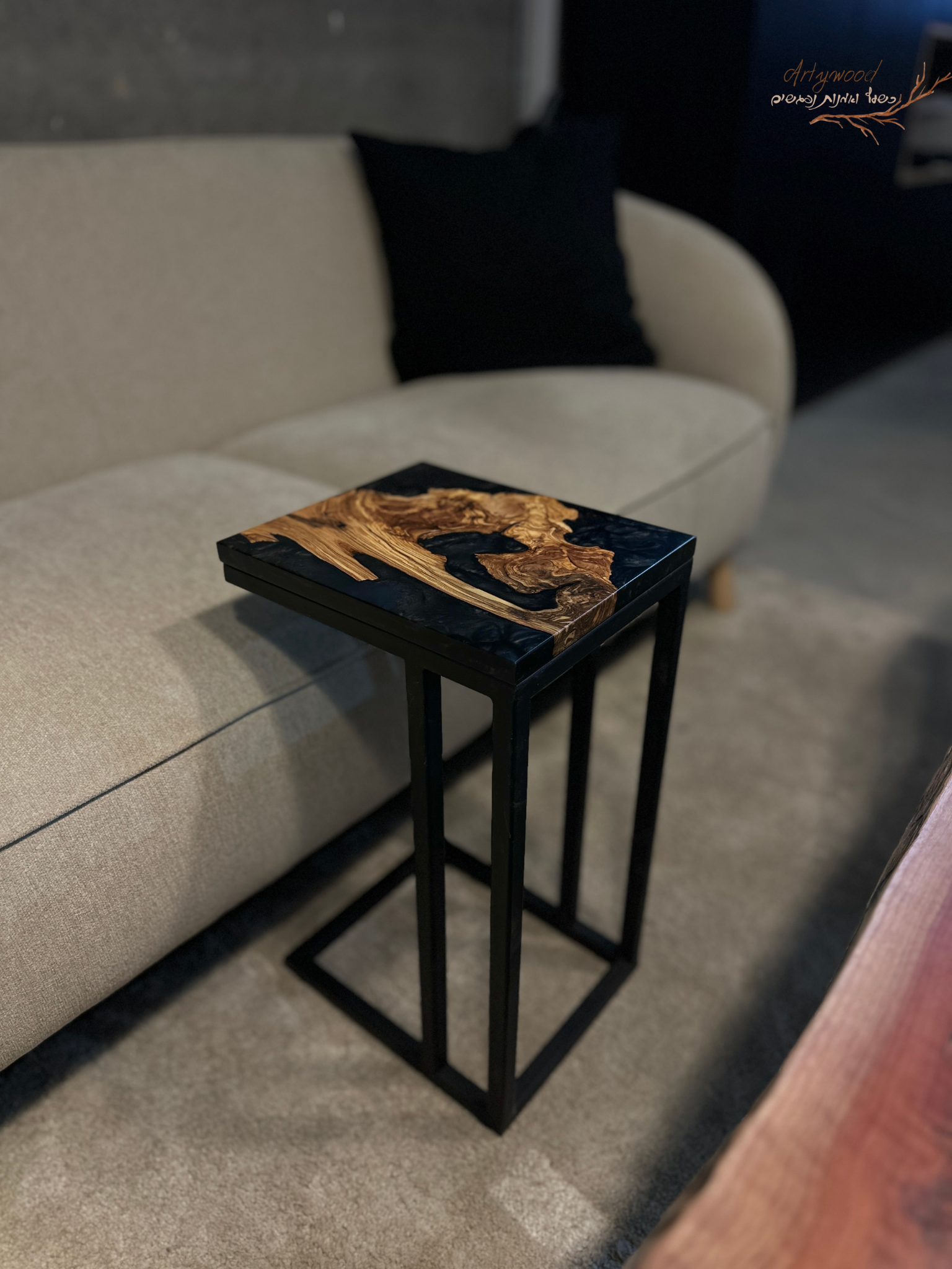 שולחן צד בעיצוב ייחודי משילוב עץ זית, אפוקסי בגוון לבחירה ורגלי מתכת שחורות