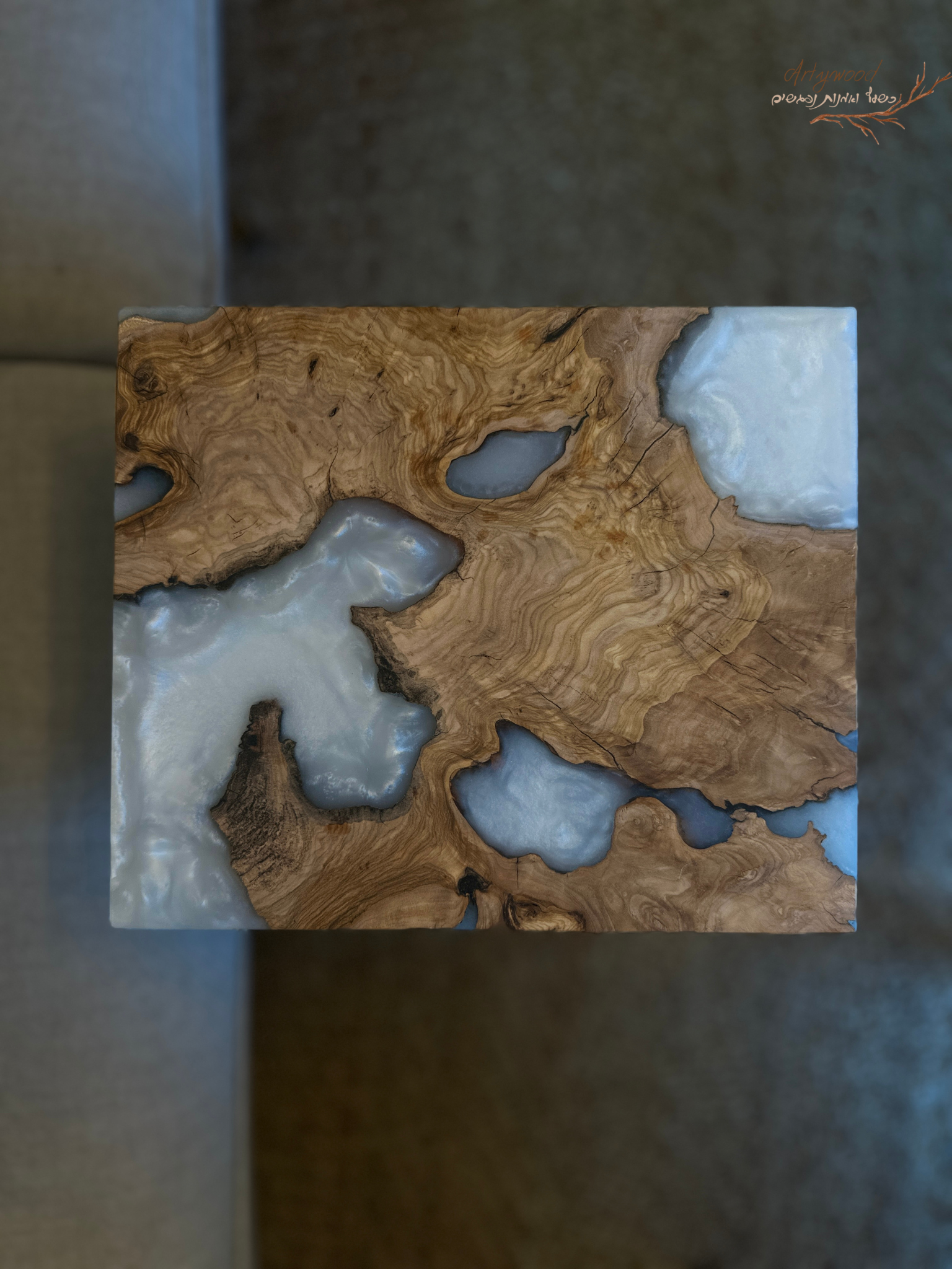 תנו לסלון שלכם מגע טבעי עם נשכן צד מעוצב, עשוי עץ זית טבעי בשילוב אפוקסי קריסטלי בגוון לבחירה!