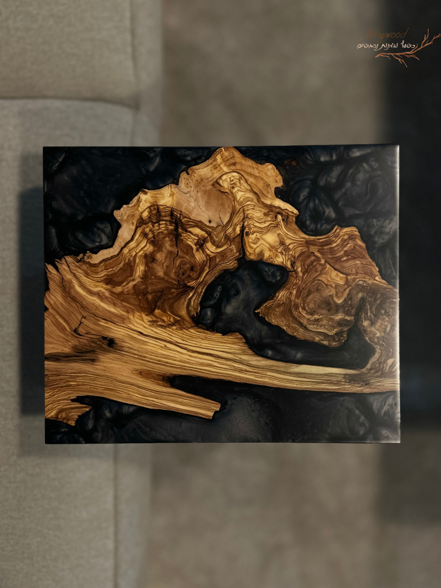 המראה הייחודי של עץ הזית עם הגוונים והטקסטורה הטבעית שלו, משתלב בצורה משולמת עם האפוקסי הקריסטלי, ויוצר פריט שהוא אמנותי ופרקטי.